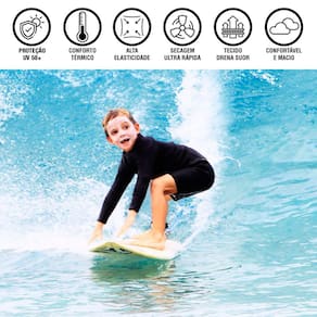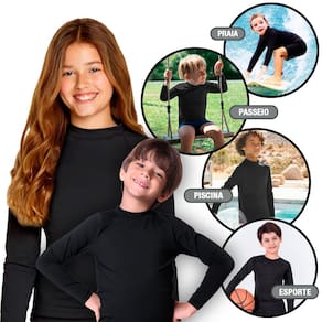 MEDIDAS DA BLUSA INFANTIL PROTEÇÃO SOLAR UV:Tamanho 6 meses - 1 ano - Largura 25 cm./ Comprimento 34 cm./ Manga (da gola até o punho) 35 cm.;Tamanho 2-3 anos - Largura 28 cm./ Comprimento 39 cm./ Manga (da gola até o punho) 37 cm.;Tamanho 4-5 anos - Largura 30 cm./ Comprimento 44 cm./ Manga (da gola até o punho) 42 cm.;Tamanho 6-7 anos - Largura 32 cm./ Comprimento 49 cm./ Manga (da gola até o punho) 46 cm.Tamanho 8-9 anos - Largura 36 cm./ Comprimento 54 cm./ Manga (da gola até o punho) 56 cm.Tamanho 10-14 anos - Largura 38 cm. / Comprimento 58 cm. / Manga (da gola até o punho) 56 cm.Produto indispensável nas brincadeiras ao ar livre, praia, piscina, mangueira no quintal, parque, passeios a pé, de bike, de skate, entre outros.Mantenha a criança protegida dos raios solares nocivos e a sua tranquilidade garantida, com a blusa camiseta proteção solar UV 50+. Com ela, os pequenos brincam livres, sem a preocupação constante de terem que usar protetores solares em creme ou spray a todo o momento. O custo X benefício é gigantesco e a diversão é garantida, até debaixo d'água.Afinal, o que significa Proteção Solar UV 50+?UV é a sigla para ultravioleta e 50 +, significa que 98% dos raios solares são bloqueados, protegendo toda a área de cobertura onde o tecido está - cabeça, rosto, nuca, orelhas, tronco, costas, ombros e braços da criança.Tecido com proteção solar UV 50 + PREMIUM, antibacteriano e com Aloe Vera. Proporcionando conforto para os pequenos.Composição do tecido:Malha 96% Poliamida e 04% Elastano (proporcionando elasticidade e um ajuste perfeito). Confeccionado com microfibra de última geração, com toque macio e pigmento que preserva de forma efetiva a proteção solar por tempo VITALÍCIO, ou seja, a camiseta e o boné podem ser lavados por infinitas vezes, preservando por todo tempo, a sua finalidade de proteção contra os raios solares.Tecido com eficácia comprovada, é submetido a rigorosos testes, realizados por laboratórios credenciados, a fim de comprovar o FPU (fator de proteção ultravioleta).Tratamento Sport Dry com Aloe Vera:Tecnologia inovadora, que permite a absorção do suor, proporcionando um alto frescor à pele sensível das crianças e evitando a proliferação das bactérias causadoras de maus odores.Modo de Lavar:Produto com secagem rápida, deve ser lavado à mão, com sabão neutro e NUNCA com produtos à base de cloro. Não deve ser passado à ferro.ATENÇÃO:Os tecidos com proteção solar ajudam a bloquear tanto os raios UVA quanto os raios UVB com a mesma eficiência. Isso é importante porque os raios UVB são responsáveis por deixar a pele avermelhada, podendo ocasionar queimaduras. Já o UVA é responsável por provocar o envelhecimento e, em alguns casos, provocar o desenvolvimento de câncer de pele, pois diferentemente dos raios UVB, eles conseguem penetrar profundamente na derme.Atualmente, os efeitos do sol passaram a ser muito mais preocupantes do que há anos, quando a população ainda não tinha conhecimento dos problemas que o astro REI pode causar. Por esse motivo, novas tecnologias (como as roupas com proteção UV) começaram a ser criadas para combater esses malefícios, a fim de trazer mais segurança para a saúde dos amantes do Verão praia e piscina.