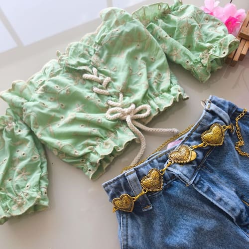 Design: Modelo cropped com ombros à mostra (ciganinha) e mangas bufantes ou com leve volume.