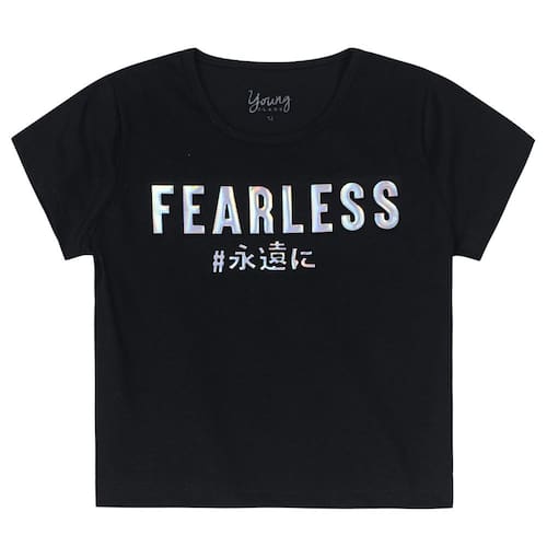 Pra compor looks estilosos e do jetio que as meninas amam, aposte na Blusa cropped teen menina confeccionada em malha, a peça conta com mangas curtas, gola redonda, aplique termocolante e estampa embossed. A dica é combinar com os shorts da coleção, garantindo movimetno para as horas de diversão. Tradução: "Destemida; Eternamente"