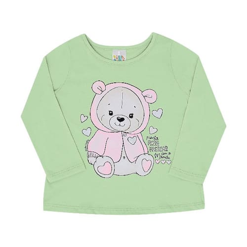 Para a mamãe que gosta de cuidar da sua menininha e ainda manter o estilo, a Pulla Bulla trouxe essa linda blusinha manga longa com uma estampa super fofa de ursinho com glitter, confeccionada em meia malha na cor verde, ideal para proteger sua princesinha nos dias de inverno.