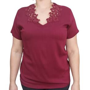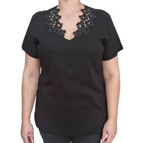 A Blusa Feminina Plus Size traz um toque romântico e sofisticado com sua gola de renda delicadamente trabalhada e bordada.
