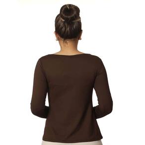 Blusa feminina manga longa decote canoa evasê, marrom, cor clássica, em tecido LIGHT CO2 biodegradável (fio AMNI SOUL ECO, o primeiro fio de nylon biodegradável do mundo), com fator de proteção solar 50FPS+ UVA e UVB.