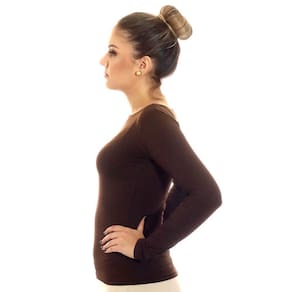 Blusa feminina manga longa decote canoa, marrom, cor clássica, em tecido LIGHT CO2 biodegradável (fio AMNI SOUL ECO, o primeiro fio de nylon biodegradável do mundo), com fator de proteção solar 50FPS+ UVA e UVB.