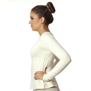Blusa feminina manga longa decote canoa evasê, cor palha clássica, em tecido LIGHT CO2 biodegradável (fio AMNI SOUL ECO, o primeiro fio de nylon biodegradável do mundo), com fator de proteção solar 50FPS+ UVA e UVB.