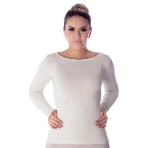 Blusa feminina manga longa decote canoa, cor palha clássica, em tecido LIGHT CO2 biodegradável (fio AMNI SOUL ECO, o primeiro fio de nylon biodegradável do mundo), com fator de proteção solar 50FPS+ UVA e UVB.