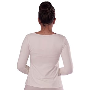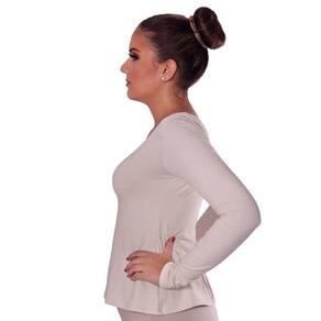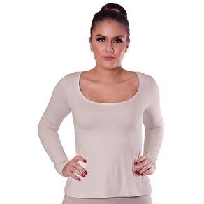 Blusa feminina manga longa decote redondo evasê, cor palha clássica, em tecido LIGHT CO2 biodegradável (fio AMNI SOUL ECO, o primeiro fio de nylon biodegradável do mundo), com fator de proteção solar 50FPS+ UVA e UVB.