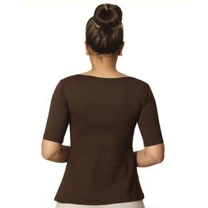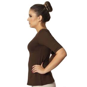 Blusa feminina meia manga decote canoa evasê, marrrom, cor clássica, em tecido LIGHT CO2 biodegradável (fio AMNI SOUL ECO, o primeiro fio de nylon biodegradável do mundo), com fator de proteção solar 50FPS+ UVA e UVB.