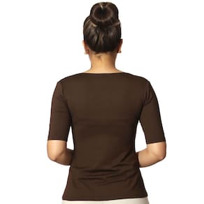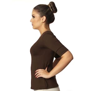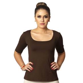 Blusa feminina meia manga decote redondo evasê, marrom, cor clássica, em tecido LIGHT CO2 biodegradável (fio AMNI SOUL ECO, o primeiro fio de nylon biodegradável do mundo), com fator de proteção solar 50FPS+ UVA e UVB.