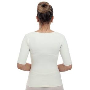 Blusa feminina meia manga decote redondo, cor palha clássica, em tecido LIGHT CO2 biodegradável (fio AMNI SOUL ECO, o primeiro fio de nylon biodegradável do mundo), com fator de proteção solar 50FPS+ UVA e UVB.