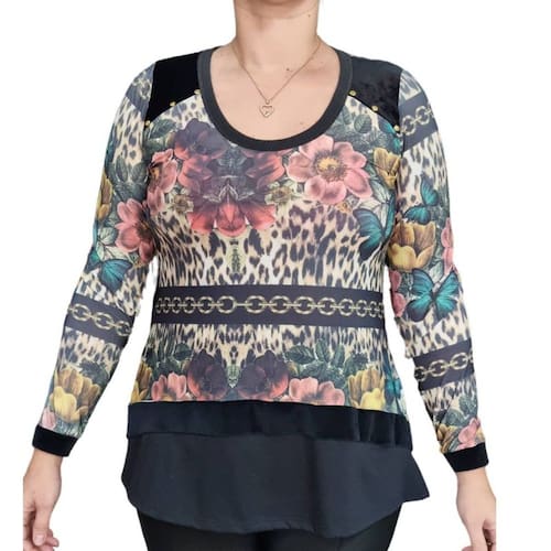 A Blusa Feminina Sodaela com manga longa (ML) traz uma estampa moderna e cheia de personalidade, perfeita para quem gosta de se destacar com elegância.
