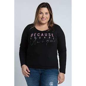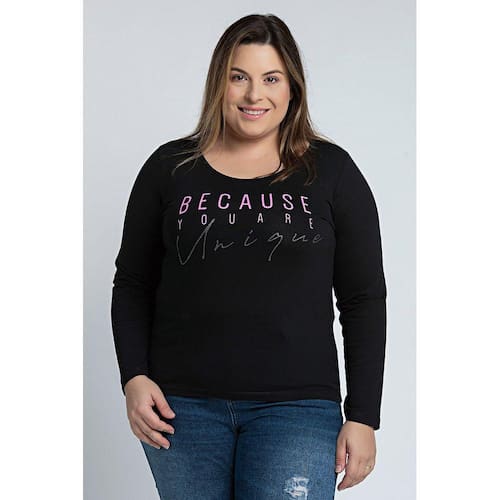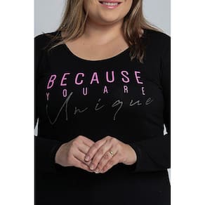 Blusa feminina elaborada em malha viscose com elastano. Estampada "Because You Are Unique" (Por que você é única). Peça com boa elasticidade, leve, toque macio. Esteja bem vestida e sinta-se confortável. Use-a no trabalho, passeio ou em casa. Seja em dias mais frios sobrepostas ou ainda em dias de temperatura mais amena como destaque do look.