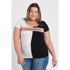 Blusa feminina plus size elaborada em malha visco. Possui estampa na frente "LIVE YOUR DREAM" (Viva seu sonho), elaborada em 03 cores contrastantes que dão um charme a mais na hora de vestir. Uma peça leve, macia, ideal para o dia. Componha os mais variados looks desde o casual ao elaborado, para o dia ou a noite, esteja bem vestida e sinta-se confortável!