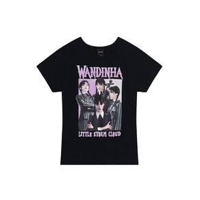 Blusa Infantil Feminina confeccionada em malha, licenciada da série ícone entre as crianças, Wandinha. A peça apresenta uma estampa localizada da personagem, destacada por um efeito metalizado na escrita, trazendo um toque moderno e divertido. Com manga curta e um design que combina estilo e conforto, essa blusa é perfeita para as fãs da série. Tradução: Pequena nuvem de tempestade
