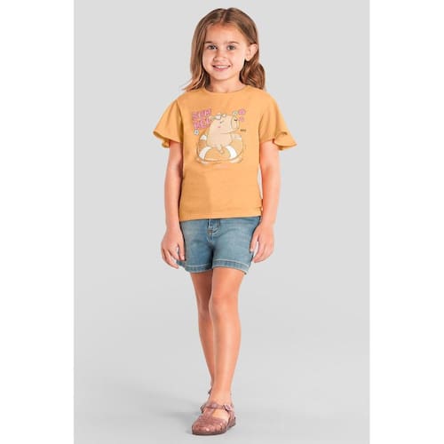 Sua pequena vai se apaixonar por esta blusa infantil da Brandili! Confeccionada em meia malha macia, ela garante conforto para todos os momentos, seja nas brincadeiras ou nos passeios em família. A estampa localizada de capivara com aplique de strass traz brilho e delicadeza na medida certa, enquanto as mangas curtas em babado adicionam um toque de charme e movimento ao look. Com gola redonda e caimento leve, é perfeita para compor combinações alegres e estilosas. Uma peça encantadora que conquista as pequenas!