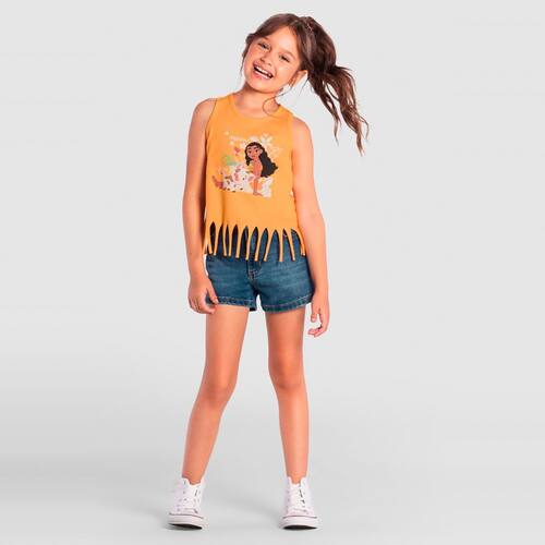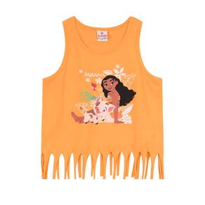 Esta regata infantil feminina, confeccionada em malha, captura a essência aventureira da princesa da Disney inspirada no filme Moana. Com uma estampa localizada da personagem, a peça é leve e fresca, ideal para os dias de verão. O destaque fica por conta do repicado de franja na barra, que adiciona movimento e um toque divertido, complementando as mangas regata para um visual cheio de estilo.