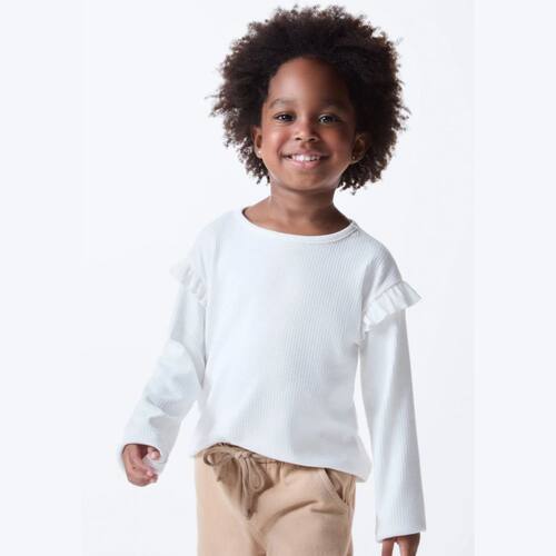 Essa blusa menina toddler de manga longa com babados apresenta uma modelagem regular, levemente ajustada ao corpo, e apresenta babados aplicados na cava das mangas. Feita de malha de ribana lisa, essa peça combina conforto com um toque de estilo, sendo versátil o suficiente para diversas ocasiões.