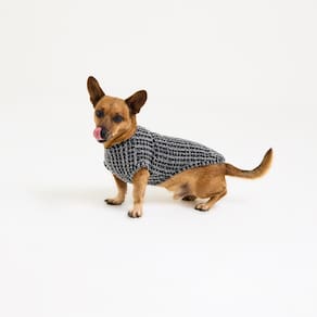Blusa Ornela Pet - Collezione Tornare Com um ar nostálgico e sofisticado, a Blusa Ornela Pet é perfeita para cães que têm estilo próprio. Feita em malha jacquard texturizada, traz um elegante motivo quadriculado retrô em fios brancos sobre fundo preto - uma referência sutil aos visuais icônicos dos anos 70.