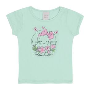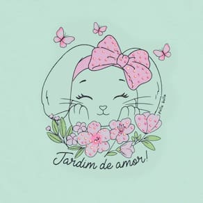Blusinha ideal para os passeios mais divertidos da estação! Confeccionada em tecido meia malha a blusinha possuí estampa frontal de coelhinha na cor tiffany com flores e escrita "Jardim do amor", ótimo para combinar com short, saia ou legging e aproveitar o dia com a priminha.