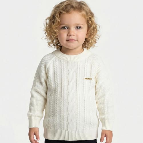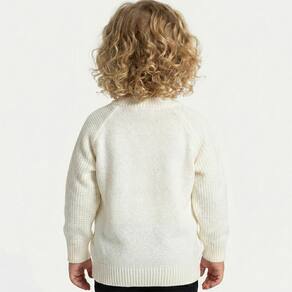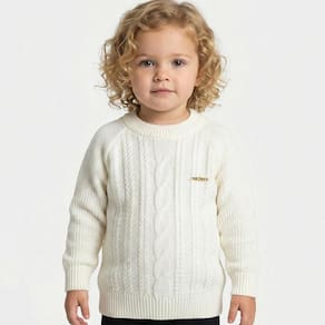 Blusa Trançada Tricô Kids feito em tecido acrílico, gola V, estampa Tricô Kids na lateral do peito, manga longa e etiquetas personalizadas.