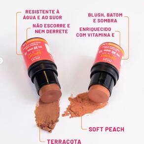 MODO DE : ;Pode ser aplicado nos lábios como Baton, nos olhos Sombra e no rosto Blush. ;Enriquecido com Vitamina E, hidrata e combate os radicais livres.Disponível em duas cores: Soft Peach e Terracota. ;ANVISA ; ;25351.515705/2021-19
