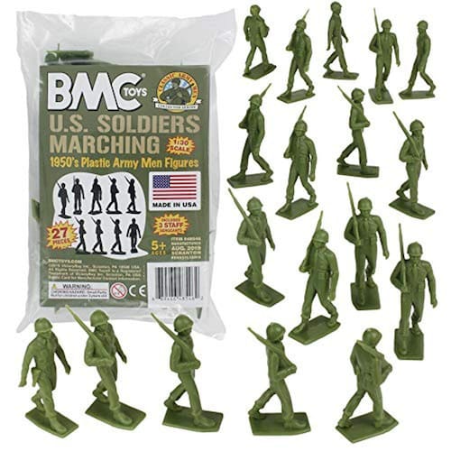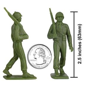Da série CLASSIC ARMY MEN COLLECTOR, BMC Toys traz de volta um conjunto icônico de figuras da Era de Ouro dos Playsets dos Homens do Exército. Este pacote de 27 Olive Drab WW2 US Soldier PLASTIC ARMY MEN é orgulhosamente fabricado nos Estados Unidos e apresenta 24 soldados marchando e 3 sargentos do estado-maior. As tropas são aproximadamente escala 1:30, têm até 2,5 polegadas de altura e são feitas de plástico LDPE flexível de cor verde oliva com bons detalhes e um pouco piscando.