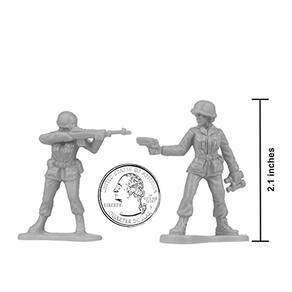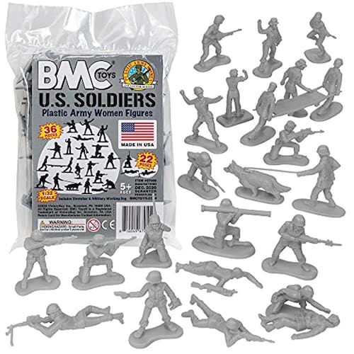 Apresentando a SÉRIE DE COLETORAS MULHERES DO EXÉRCITO DE PLÁSTICO DA BMC Toys. Este novo conjunto de figuras femininas é projetado no estilo clássico dos melhores homens do exército de plástico de meados do século XX. O conjunto inclui 36 peças em 22 poses diferentes, juntamente com um cão de trabalho com acessórios de coleira e maca. As poses incluem Pathfinder Captain, Combat Pathfinder Captain, Standing Rifleman, Kneeling Rifleman, Prone Rifleman, Kneeling Sharpshooter, Prone Sharpshooter, Advanceing with Bayonet, Grenadier, Bazooka Operator, Running Riflemen, Combat Medic, Low Crawling, Radio Operator, Wounded Soldier, Light Machine Gunner, Nurse, Corpsman, Mechanic, Military Working Dog, MWD Handler, e acessório de maca. Estas tropas têm até 2,1 polegadas de altura, têm aproximadamente 1:32 de escala, e feitas de plástico LDPE cor cinza ligeiramente flexível. Os uniformes e equipamentos são modelados por volta do período de 1960 e se encaixam com as eras da Guerra da a e do Início da Guerra do Vietnã, bem como o treinamento na década de 1970. Os rostos e figuras são inspirados por soldados reais do início dos anos 1900 até os dias atuais. Este é um conjunto de verdadeiros heróis de plástico americanos, destinados a serem criados, derrubados, pegos e jogados nos anos seguintes. Embalado em polibag com placa de inserção e recomendado para maiores de 5 anos.