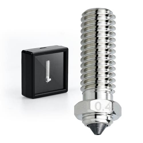 - O carboneto de tungstênio é 3 vezes mais condutor térmico do que o rubi e tem excelente desempenho na impressão de filamentos altamente abrasivos, como materiais preenchidos com fibra de carbono/vidro, preenchidos com metal e materiais que brilham no escuro.