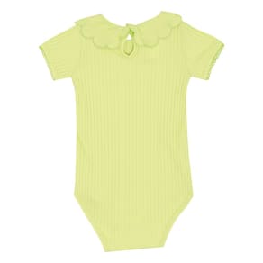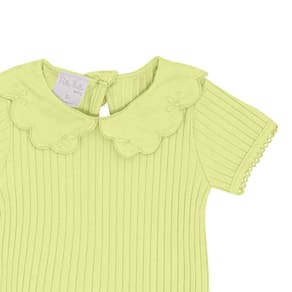 Body manga curta confeccionado em malha canelada na cor lima, a malha tendência para as meninas também chegou para as babys fashionistas com detalhe de babado na gola, possuí abertura de botões entre as pernas e para facilitar a vestimenta também possuí abertura nas costas com botão. Sua fashionista vai encantar a todos no dia a dia!