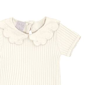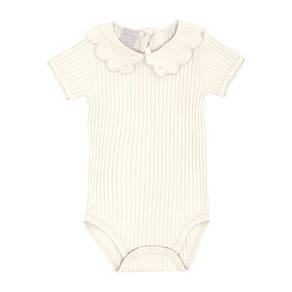 Body manga curta confeccionado em malha canelada na cor off white, a malha tendência para as meninas também chegou para as babys fashionistas com detalhe de babado na gola, possuí abertura de botões entre as pernas e para facilitar a vestimenta também possuí abertura nas costas com botão. Sua fashionista vai encantar a todos no dia a dia!