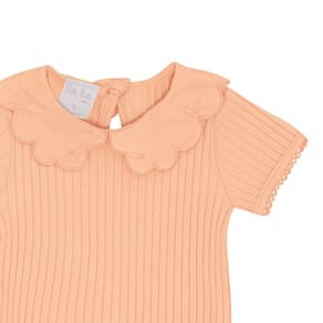 Body manga curta confeccionado em malha canelada na cor pessego, a malha tendência para as meninas também chegou para as babys fashionistas com detalhe de babado na gola, possuí abertura de botões entre as pernas e para facilitar a vestimenta também possuí abertura nas costas com botão. Sua fashionista vai encantar a todos no dia a dia!
