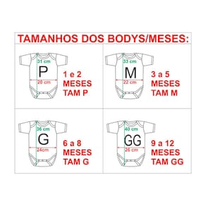 Tamanhos do P ao GG - veste de 1 a 12 meses.