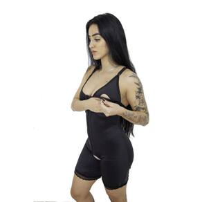 Confeccionado em cetinete estruturado, altamente compressivo, leve e macio. Busto anatômico, sem aro, com frente que se destaca por inteiro, com fechamento em fecho click plástico, facilitando a amamentação. Reforço estratégico em tecido duplo localizado na parte frontal da peça. Modela a cintura, comprime o abdômen e corrige a postura. Pernas cavadas com acabamento em elástico suave. Abertura nos entrepernas com fechamento em colchetes de dupla regulagem. Costas retas, na altura do busto. Traseiro levemente cavado. Alças reguláveis.