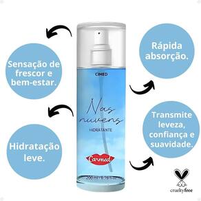 Body Splash Carmed nas Nuvens Cimed 200mln Body Splash Carmed Nas Nuvens 200mlO Body Splash Carmed Nas Nuvens é perfeito para quem busca leveza e sofisticação no dia a dia. Com uma combinação irresistível de âmbar, maçã verde e algodão-doce, essa fragrância traz um toque fresco e adocicado, deixando sua pele suavemente perfumada e hidratada.Seu aroma transmite suavidade e confiança, como se você estivesse flutuando em nuvens macias e pronta para conquistar o mundo..Benefícios:- Fragrância única e envolvente com notas de maçã verde, âmbar e algodão-doce- Sensação de frescor e bem-estar ao longo do dia- Hidratação leve para a pele, graças ao pantenol e ao pidolato de sódio- Textura suave e rápida absorção, ideal para qualquer ocasião- Fácil de reaplicar, deixando você sempre perfumada e renovada.Modo de Uso:1. Borrife o Body Splash Carmed Nas Nuvens diretamente sobre a pele.2. Aplique nas áreas de maior circulação, como pulsos, pescoço e atrás das orelhas, para uma fixação prolongada.3. Pulverize a uma distância de 15 a 20 cm da pele.4. Reaplique sempre que desejar renovar a fragrância..O produto hidrata a peleSim Ele contém pantenol e pidolato de sódio, que ajudam a manter a pele hidratada e perfumada ao mesmo tempo.Quanto tempo dura a fragrância na peleA fixação pode variar de acordo com a pele, mas costuma durar várias horas. Para prolongar o aroma, aplique em áreas estratégicas como pulsos e pescoço e reaplique ao longo do dia.Pode ser em qualquer tipo de peleSim, o Body Splash Carmed Nas Nuvens foi formulado para ser em todos os tipos de pele.Posso aplicar o body splash nas roupasO ideal é aplicar diretamente na pele, mas se desejar usar nas roupas, faça um teste em uma área discreta para evitar manchas. Marca: Não Informado Ean: 7897947620940
