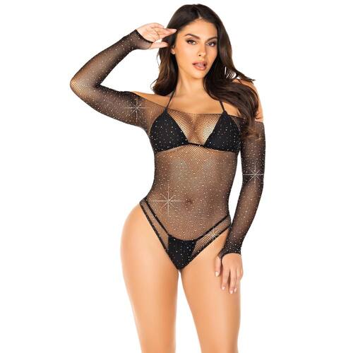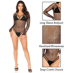 Leg Avenue Body arrastão feminino de manga comprida com strass, Preto