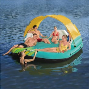 Divirta-se na água com até 5 pessoas flutuando no durável e resistente Sunny lounge. Refresque-se balançando os pés na água ou relaxe sob o sol. Quando quiser se bronzear, basta retirar o guarda-sol e relaxar . Esta é uma ótima maneira de relaxar e desfrutar de um dia refrescante na água. Você vai querer entrar na diversão que a Ilha Flutuante Sunny lounge proporciona
