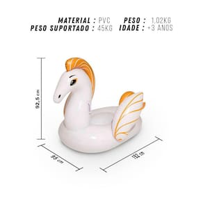 Voe até seus sonhos na Boia Pegasus M Com 1,52m de comprimento e 95cm de altura, ela tem capacidade para até 45 kg. Conta com duas alças para maior segurança e possui assento central pra aproveitar com conforto os momentos na piscina ou praia. Produzida em vinil resistente, conta com duas câmaras de ar independentes e acompanha adesivos de reparo. Aproveite suas férias no maior estilo, seja na praia, no rio ou no clube e faça fotos incríveis na sua festa na piscina. Este não é um equipamento salva-vidas. Nunca deixe crianças sozinhas perto da água sem supervisão de um adulto. Item certificado pelo Inmetro.