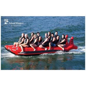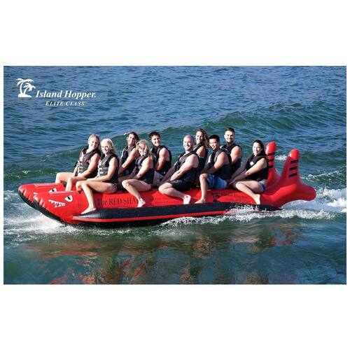 ENVIAMOS NO MESMO DIA ÚTIL QUE O PEDIDO DO FABRICANTE DA CALIFÓRNIA. O banana boat Red Shark de 10 homens redesenhado é mais largo e mais estável, construído para uma excelente pré forma em condições de águas agitadas e uso oceânico. Material Resistente a UV resistente a UV reforçado 1100 denier 1.1 Litros PVC. Material denso resistente a perfurações, reforçado em áreas de alta tensão. Elite Class Costuras soldadas para durabilidade e longevidade. Anéis de tração de aço inoxidável, arnês de reboque com alavanca de aço Marca: Não Informado