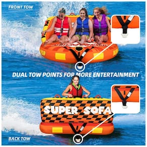 Boia aquática para 1-3 passageiros para passeios de barco: Com capacidade máxima de peso de 231 kg (510 libras), este tubo rebocável oferece amplo espaço e conforto para até 3 passageiros. Seu tamanho inflado é de 196 x 180 x 89 cm (77 x 71 x 35 polegadas), utilizando um robusto airbag de PVC de 0,8 mm, completamente envolto por uma capa de nylon 840D com costura dupla. Este design garante conforto e durabilidade, proporcionando anos de uso e resistência.
