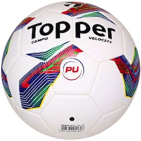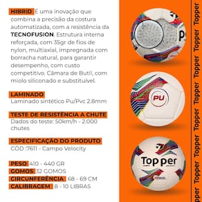 Marca: Topper Peso: 410 - 440 gr Gomos: 32 Gomos Circunferência: 68 - 69 cm Calibragem: 8 - 10 Libras Modelo: Velocity Hibrid Indicação: Campo de futebol ou treino Costura: Costurada Material da câmara: Câmara da Butil Toque: Macio e resistente Cor: Branca, com detalhes gráficos multicoloridos (azul, vermelho, verde, amarelo e preto) Tamanho: Oficial