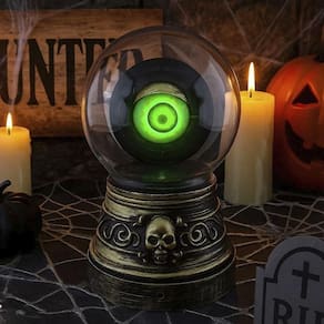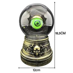 O olho acende, projetando uma luz verde fantasmagórica que adiciona um toque sombrio à sua decoração.