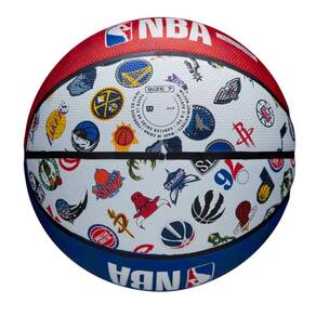 A Bola de Basquete NBA All Team #7 da Wilson celebra a paixão pelo jogo com um visual marcante nas cores vermelha, azul e branca, reunindo os escudos das 30 equipes da liga em um só lugar.