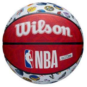 A Bola de Basquete NBA All Team #7 da Wilson celebra a paixão pelo jogo com um visual marcante nas cores vermelha, azul e branca, reunindo os escudos das 30 equipes da liga em um só lugar.