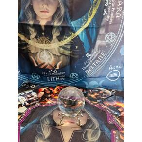 O kit inclui: 1 Bola de Cristal + Base metálica + Toalha Wicca.