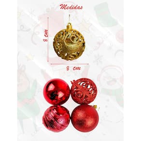Bola de Natal 24 Un Vermelha Grande 8cm Mista Glitter LuxoDecore sua Arvore de Natal com essas lindas Bolas vermelhasSão 4 modelos diferentes nesse kit pra deixar sua decoração mais completa e trazendo um toque luxo pra sua arvoreCada bola possui 8 cm e fitilho individual para facilicar sua colocação nos galhos. os modelos sãoGlitterVazadaBoneco de NeveLisaAdquira jáFICHA TÉCNICAMaterial: PlásticoMedidas:8cmCARACTERÍSTICASResistenteGrandesDetalhes dourados4 modelos diferentesAguardamos seu pedidoObrigado pela preferência Marca: Klizz