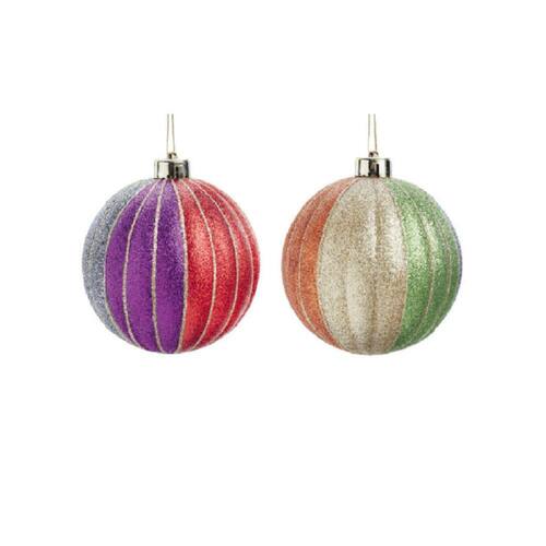 Descrição: Conjunto de 2 bolas coloridas com relevo similar a gomos, divididas em cores e totalmente revestidas em glitter.