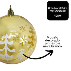 Com 10cm de diâmetro, é uma bola de tamanho grande que se destaca na composição de árvores, guirlandas ou arranjos decorativos. Fabricada em material translúcido com acabamento dourado e aplicação de estampa branca, une beleza e qualidade em um único item.