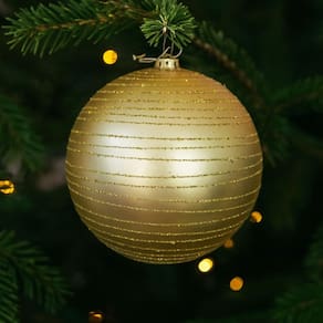 Destaque sua decoração com esta bola natalina grande de 15cm de diâmetro, perfeita para árvores maiores, arcos de festões e até fachadas. O acabamento em Dourada fosco com detalhe em espiral glitter dourado traz brilho e sofisticação para composições natalinas modernas ou tradicionais.