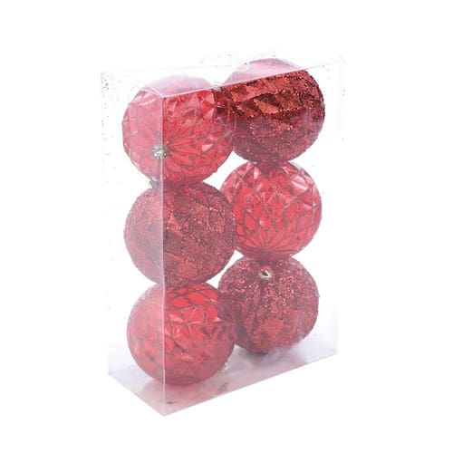 Descrição: Conjunto de 6 bolas de Natal, sendo 3 bolas vermelhas translúcidas e 3 bolas vermelhas opacas, ambas com relevo em formato de rede vermelha em glitter.