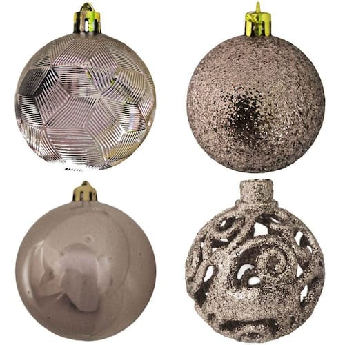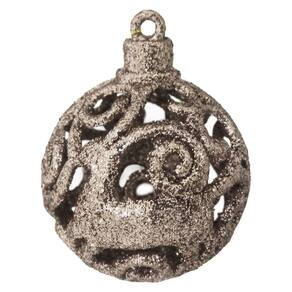 - Bola de Natal Champanhe com Glitter Vazada: toda decorada com um relevo vazado de forma arabesca que causa um contraste único;