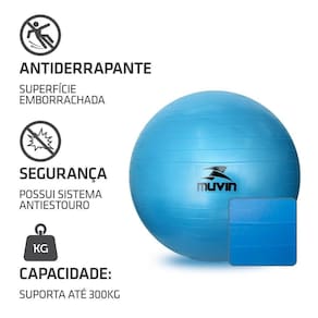 Acompanha bomba: a bola de pilates da muvin acompanha uma bomba para que ela seja inflada. É de fácil utilização e, por essa questão, também permite que seja esvaziada a qualquer momento caso seja necessário guardar em lugares menos espaçosos